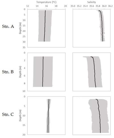 Regarding temperature and salinity data, no relevant variations along the water column were observed in any of the stations (Figure 6). This suggests well-mixed water columns during sampling.