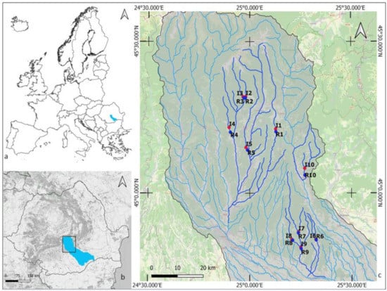 Our field sampling took place between May and June 2018 in the Middle Argeș River Basin, located in south-eastern Romania (Figure 1, Tables S1 and S2). The Argeș River is a major tributary of the River Danube, and its catchment is representative of a sylvo-steppe landscape. Agriculture is the dominant land use, representing 56% of the total catchment area of 125 km2. Other human pressures include aquaculture, forestry, hydropower, industry, and urban development [21]. Human impacts on the region’s stream–riparian networks have serious consequences, including increased flooding, water pollution, and the spread of invasive species (i.e., Fallopia japonica). Our case study was part of the CROSSLINK project, and the study design was based on the CROSSLINK paired sites approach (see [6]). We choose 10 paired stream–riparian sites in a landscape modified by agriculture, with the no woody riparian buffer site (UBF) located upstream of the forested vegetation buffer site (FBF) (see [6], Figure 1). All streams are 1st to 3rd order [22], mostly 2–6 m wide, with the streambed dominated by gravels and cobbles. Woody riparian buffers were a minimum of 50 m in length, moving upstream from the downstream end of the sampling reach, with a width of 2–3 times the wetted stream width and consist mainly of large trees (Diameter at Breast Height (DBH) > 5 cm) on both banks. The vegetation of the UBF sites (hereafter named unbuffered sites) was dominated by grass and herbs, with few shrubs and small trees (DBH < 5 cm). Information on the geographical location is listed in Table S1 (Supplementary Materials).