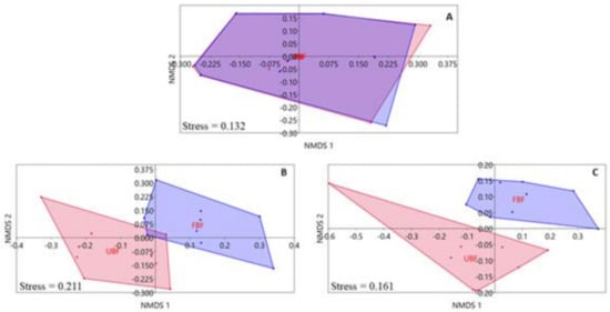 The unconstrained (nMDS) ordination of sites based on values of environmental variables from the catchment (A) and the local scales: riparian habitat characteristics (B), riparian integrity condition scores (C). Unbuffered sites (UBF) = red, forested buffered sites (FBF) = blue.