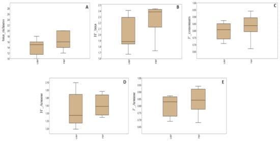 The median value of diversity indices of riparian invertebrate community in unbuffered (UBF) and buffered sites (FBF). Only the indices showing significant (* p < 0.05) and marginally significant (p < 0.1) differences between the site types (see Table 2) are shown. The box = 25–75 percent quartiles, the whiskers = minimal and maximal values. A = taxa richness, B = taxa Shannon diversity, C = consumer Pielou’s evenness, D = Araneae Shannon diversity, E = Araneae Pielou’s evenness.