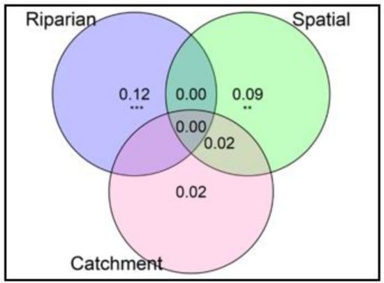 To detect spatial structures in communities (e.g., spatial autocorrelated data), we explicitly incorporated the spatial predictors into the statistical model. Principal Coordinates of Neighborhoods Matrix (PCNM) in R (vegan, dist) was used to decompose the spatial location of sites into PCNM functions used to express distances in the rectangular for ecologically relevant spatial scales. The descriptors of spatial relationships (PCNM base functions) were obtained by principal coordinate analysis of a truncated matrix of Euclidean (geographic) distances among the sampling sites [39]. PCNM base variables were used as spatial descriptors in the multivariate variation partitioning [40,41]. Variation partitioning (varpart, vegan package in R) was used to reveal the relative and shared effect of significant variables in shaping the riparian invertebrate communities’ structure. We used Venn diagrams to visualize the variation partitioning results. To reduce the predictor list and select significant variables for RDA and variation partitioning models, we fitted variables for each group individually (catchment-wide properties, riparian habitat characteristics, and riparian integrity condition scores) and fit global models for estimation of corresponding adjusted R2. The forward selection method in RDA, with appropriate stopping criteria (the adjusted coefficient of multiple determination, R2 adj, permutation test with 999 randomizations, and an alpha significance level of 0.05) was used to assess which variables are essential (forward.sel function in the packfor package in R). The forward selection method prevents overestimation of the explained variance [39].