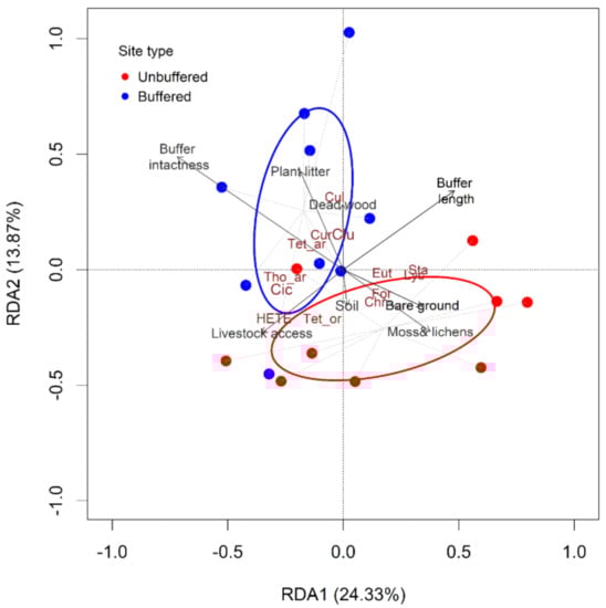 Redundancy analysis (pRDA) of riparian invertebrate communities at nine paired sites in the Argeș basin, Romania, showing the influence of riparian attributes after conditioning out confounding Spatial location and Catchment level variables (i.e., land use). Riparian attributes used in the pRDA are shown in black (auto-correlated variables were not included in the analysis; Pearson’s correlation, p < 0.05). Buffer intactness, Buffer length, %Bare-ground, %Small trees and shrubs, %Moss and lichens, %Plant litter, %Herbs, Dead wood volume, and Soil drainage were included. The species with the highest scores along the first two pRDA axes are shown in dark brown: Araneae: Thomisidae = Tho_ar, Tetragnathidae = Tet_ar, Clubionidae = Clu, Culicidae = Cul, Coleoptera: Curculionidae = Cur, Hemiptera: Cicadidae = Cic are associated with buffered sites (blue ellipse and blue dots), whereas other Hemiptera = HETE, Orthoptera: Tettigoniidae = Tet_or, Hymenoptera: Formicidae = For, Coleoptera: Staphylinidae = Sta, Chrysomelidae = Chr, Araneae: Lycosidae = Lyc, Eutichuridae = Eut, are associated with unbuffered sites (red ellipse and red dots).
