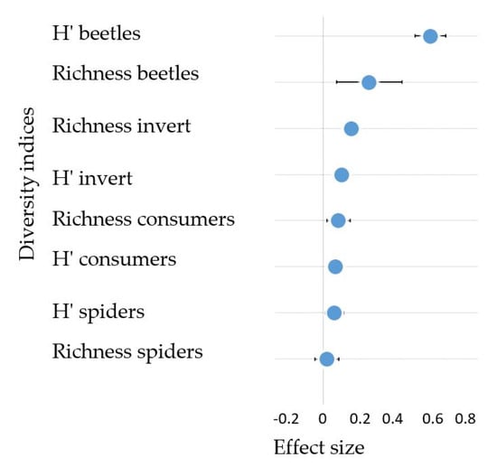 We also tested the mean effect size of the changes in riparian invertebrate community conferred by improved riparian conditions (i.e., forested buffers). None of the diversity indices showed negative effects with the presence of forest buffers. In particular, forest buffers had a strong positive effect on beetle diversity (Shannon Index) and a weak positive effect on beetle richness and richness and diversity of total invertebrate community (Figure 6).