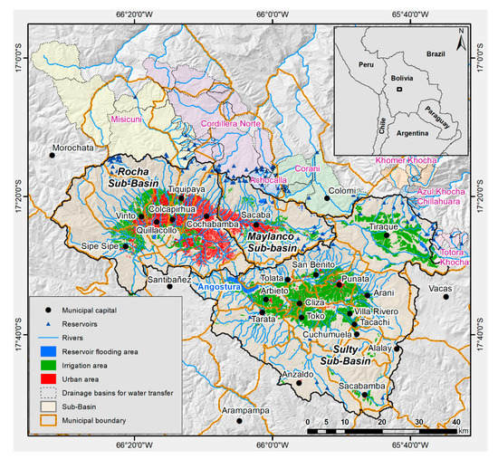 The Rocha River Basin is located in the department of Cochabamba in the Plurinational State of Bolivia and contains all or part of 25 rural and urban municipalities (Figure 1). The basin has an area of approximately 3699 km2 and a population of almost 1,300,000 people (13% of the country). From the hydrological point of view, it is comprised of three sub-basins: Rocha, Maylanco, and Sulty (also known as Valle Alto). The Rocha and Maylanco sub-basins—for decades predominantly agricultural areas—are rapidly urbanizing, including cities such as Cochabamba, Sacaba, Colcapirhua, Vinto, Tiquipaya, and Sipe Sipe, which make up the greater Cochabamba metropolitan area. In contrast, the Sulty sub-basin is mainly rural, with agriculture as its primary economic activity. Climatically, 80% of the annual precipitation is concentrated between the months of December and March (rainy season), 2% between the months of May and August (dry season), and the remaining precipitation in the months of the transition seasons (April, September to November) []. Annual rainfall varies between 300 and 900 mm, wetter to the north and the east, where most of the water supply reservoirs and current and potential sources of inter-basin transfer are located (Figure 1).