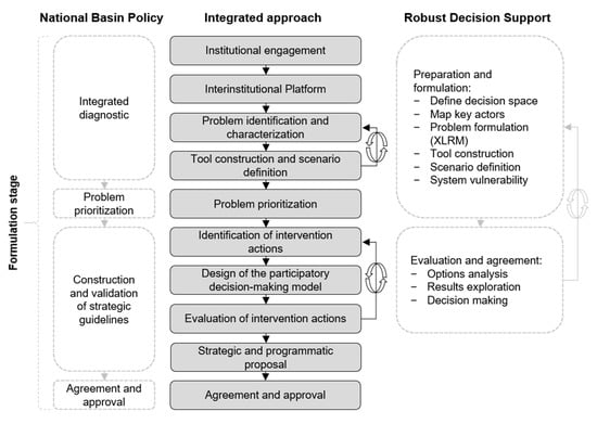 The guiding framework of the PDC contemplates three stages: formulation, implementation, and evaluation and monitoring. Each of these stages has a step-by-step process with general guidelines (Figure 2). All stages rely on public participation of the basin’s institutions and actors as an essential element to promote environmental governance. The formulation stage comprises an integral participatory appraisal that allows for the identification and prioritization of the main objectives of basin and water management, albeit without the benefit of detailed modeling and analysis. This stage also considers the identification, construction, and validation of actions to achieve the proposed objectives. Stakeholder participation is a key element for the PDC guidelines and the RDS framework. The institutional approach and the mapping of key actors are considered at the beginning of the process for both cases.