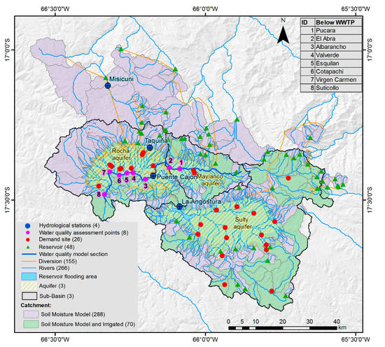 - MMAyA. Modelación Estratégica de la Cuenca del Río Rocha; Ministerio de Medio Ambiente y Agua con apoyo financiero de la CAF: La Paz, Bolivia, 2018.