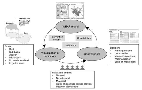 The Robust Decision Support (RDS) framework proposed by Purkey et al. [] consists of an iterative bottom–up process with active stakeholder participation where decisions are supported by the use of water resources models, which are accompanied by a strong process of local capacity building. Case studies for RDS include urban water management in the metropolitan region of La Paz/El Alto, Bolivia [], evaluation of climate change impacts in a large basin in northern Patagonia, Argentina [], and implementation of an IWRM planning process in the Yuba River basin, California [,]. This paper presents innovations in the RDS participatory framework as a contribution to Bolivia’s National Watershed Policy, specifically in the formulation of the Rocha River Basin Master Plan (PDC in Spanish), which is located in the Cochabamba Valley, Bolivia. This effort took place within Bolivia’s unique historical and political context related to water management. Our methodological approach consists of combining the RDS framework for water resources management [] to extend Bolivia’s guiding framework for the formulation of river basin master plans. We address the following questions: How does the water resources system model respond to water-related decision-making processes and institutional governance design at a range of scales within a river basin? How does the water resources system model contribute to the development of effective water planning instruments?