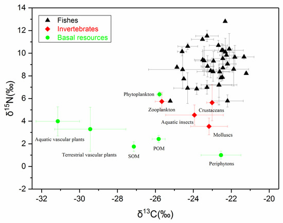 Stable isotope (δ13C and δ15N) signatures bi-plot for basal resources (green dots), invertebrates (red diamonds), and fishes (black triangles) in the midstream of the Chishui River.