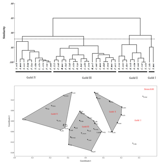 Hierarchical cluster analysis (Bray–Curtis similarity) and non-metric multidimensional scaling (NMDS) ordination based on δ13C and δ15N signatures for trophic guilds of fish in the midstream of the Chishui River. Guild I represents herbivores; Guild II represents herbivore-based omnivores; Guild III represents carnivore-based omnivores; Guild IV represents carnivores.