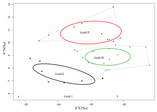 As the metrics of trophic niche have shown, the guild of herbivores (Guild I) had higher values in the δ13C range (CR) and the guild of carnivores (Guild IV) had higher values in the δ15N range (NR); the corrected standard ellipse area (SEAc), the total area of the convex hull (TA), and the mean distance to the centroid (CD) were also larger for carnivores (Guild IV) and herbivores (Guild I) (Table 3, Figure 4). These results indicate that herbivores (Guild I) and carnivores (Guild IV) exhibited greater trophic diversity. However, the herbivore-based omnivores (Guild II) and carnivore-based omnivores (Guild III) exhibited lower mean nearest neighbor distance (MNND) and standard deviation of nearest neighbor distance (SDNND), which indicates that the omnivores had higher trophic redundancy (Table 3, Figure 4).
