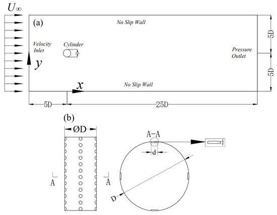 Figure 1. The schematic diagrams of the computational domain and the cylinder: (a) Computational domain; (b) The distribution of four columns of dimples on the surface of the cylinder.