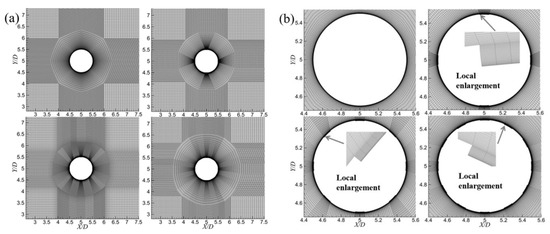 Figure 2. Schematic diagrams of the mesh: (a) Computational grid; (b) Close-up of the grid around the cylinder.