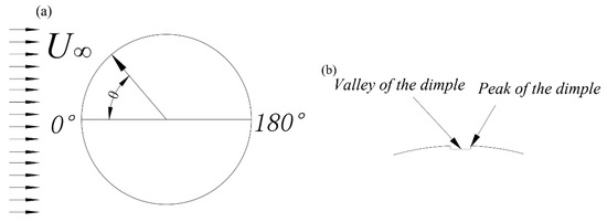 Figure 3a depicts a schematic sketch for monitoring the pressure coefficient and the skin friction coefficient. θ is the monitoring angle relative to the streamwise direction. The initial monitoring point is set at θ = 0°, and the angle ranges from 0° to 180° (along the streamwise path). Figure 3b shows the schematic sketch of a dimple. The dimpled interior can be regarded as the dimple valley, and the sharp edge can be viewed as the peak of the dimple [31].