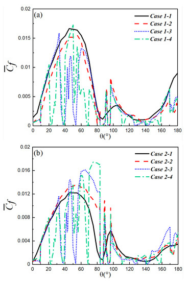 At Re = 1 × 105, as shown in Figure 4a, C f ¯ first increases and then decreases with the increase of θ for Case 1-1 in the range of 0° < θ < 87° and reaches the maximum value at θ ≈ 50°. The curve of C f ¯ for Case 1-1 is relatively smooth. However, for Case 1-2, Case 1-3, and Case 1-4, it is evident that the value of C f ¯ will decrease sharply then increase suddenly at the dimple positions, and the minimum value is around 0. Other than that, at the same place on the cylinder surface, C f ¯ of Case 1-2, Case 1-3, and Case 1-4 is greater than that of Case 1-1 (except for the location of 90° < θ < 120°). For this reason, the skin friction drag obtained by integrating on the circular cylinder with the dimpled surface is less than that of the smooth cylinder. When 90° < θ < 120°, there is a phenomenon of vortex reattachment, and the dimple will enhance this phenomenon, so C f ¯ of the circular cylinder with the dimpled surface will be higher than that of the smooth cylinder.