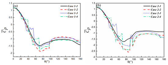Figure 4 and Figure 5 expose the time-averaged skin friction coefficient C f ¯ (Cf = τω/0.5ρU2, where τω is the shear stress) and the time-averaged pressure coefficient C p ¯ (Cp = (pθp)/0.5ρU2, where pθ is the pressure at the rear stagnation points, and p is the reference pressure at the inlet). It is known that the skin friction drag is the integral of the shear stress on the cylinder surface, and the pressure along the cylinder surface can be integrated to obtain the pressure drag. Therefore, C f ¯ and C p ¯ can represent the skin friction drag and pressure drag on the cylinder surface.