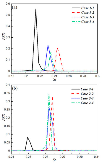 Figure 6 profiles the relationship between the PSD and the St (St = fD/U, where f is the vortex shedding frequency, D is the cylinder diameter, and U is the flow velocity). As plotted in Figure 6a, at Re = 1 × 105, it is evident that the peak values of PSD of Case 1-2, Case 1-3, and Case 1-4 are smaller than that of Case 1-1 [9,33], indicating that the dimpled structure can reduce the strength of vortex shedding. The distribution characteristics of the curve in Figure 6b are entirely different from those in Figure 6a, in that the peak values of PSD of Case 2-2, Case 2-3, and Case 2-4 are much higher than that of Case 2-1. It is conceivable that the dimpled structure will increase the strength of vortex shedding at Re = 2 × 105. The advantage of vortex shedding will affect the structure of the flow field and the size of the vortex. Thus, it is a non-negligible factor influencing the drag of the cylinder.