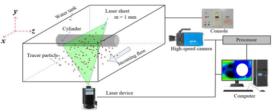Figure 7 also presents the experimental set-up of high-speed PIV. A high-speed camera (pco. dimax S1) with a resolution of 1008 × 1008 pixels was used to capture the 2000 successive digital particle images at a time interval of 1 ms (i.e., 1000 frame per second) between two consecutive images, and the shutter speed of each frame is set at 1.5 μs. A thin light-sheet of thickness m = 1 mm produced by a high-intensity continuous light source (Figure 7) was used to illuminate the tracer particles (the diameter of the tracer particle is 10 μm) around the cylinder. The distance from the camera’s focal plane mark to the light-sheet plane was fixed at about 0.5 m. The PIV view software based on the spatial cross-correlation method was applied to record the particle trajectories in the flow around a cylinder.