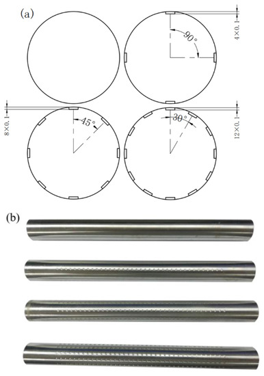 The cylinders used in the experiment are made of aluminum, and the dimples are machined by the Computer Numerical Control (CNC) machining center. The length of the cylinders is 302 mm, and their diameter is 20 mm. The diameter (d) and depth (h) of the dimples are 2 mm (d/D = 0.1) and 0.1 mm (k = h = 0.1 mm, k/D = 5 × 10−3), respectively. The distance between two dimple centers is 4 mm, and the dimples are evenly distributed on the cylinder. Figure 8 provides the specific size data and finished product.