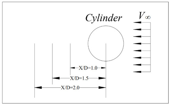 As shown in Figure 9, to analyze the backflow velocity of cylinders in the experiment, the streamwise velocities of three locations close to the cylinder in the backflow region are extracted and compared. The measurements are performed at three different locations: X/D = 1.0 (location A), X/D = 1.5 (location B), and X/D = 2.0 (location C) from the center of the cylinder.