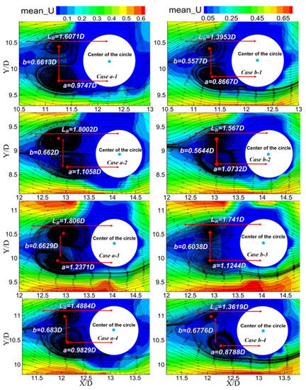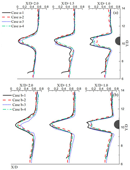 The averaged streamwise velocity ( U ¯ /V) profiles in the near wake behind the cylinder are reported in Figure 10. According to Figure 10, it is apparent that the velocity curve shows a “U” shape near the cylinder, while the curve changes and presents a “V” shape away from the cylinder. These phenomena can also be found in the research of Aguedal et al. [35].