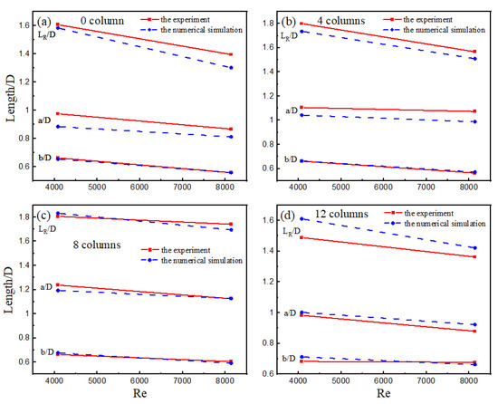Figure 13. Variation of the normalized length scales of the cylinders with respect to Re: (a) the smooth cylinder; (b) the cylinder with 4 columns of dimples; (c) the cylinder with 8 columns of dimples; (d) the cylinder with 12 columns of dimples.