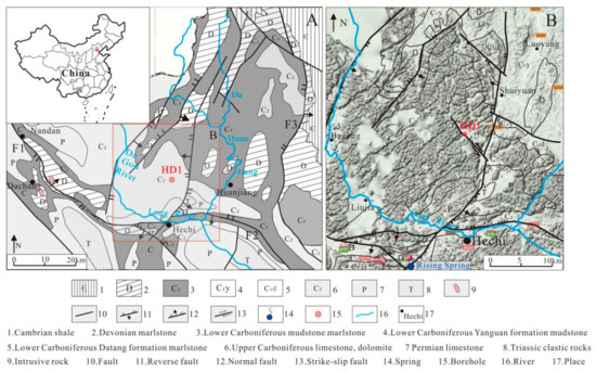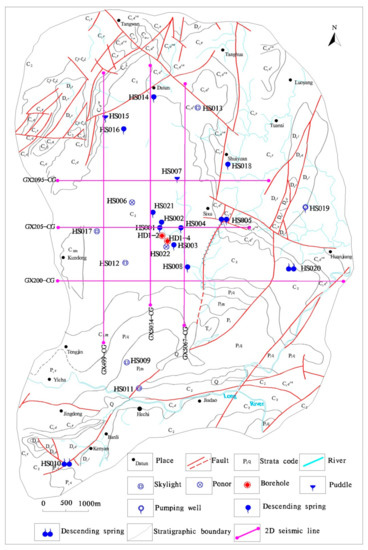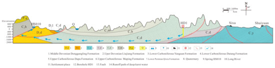 The soluble carbonate rocks in the area are Carboniferous-Permian platform facies carbonate rocks with large area outcropping; however, karstification of marlstone and silicalite in Devonian and clastic rocks in Triassic are not found. The main karst strata are the Datang formation of Lower Carboniferous, the Dapu, Huanglong, and Maping formations of Upper Carboniferous, and the Qixia, Maokou, and Heshan formations of Permian, with accumulative thickness of thousands of meters. Except for the Dapu formation, which is a set of fine-medium dolomites and lime dolostone, the formations are pure limestone, which belongs to the continuous formation of mega-thick carbonate rocks with strong solubility [35,36]. The argillaceous content in the lower part of Lower Carboniferous increases and gradually transitions to the large shale of the Yanguan formation of the Lower Carboniferous, which is the bottom boundary of karstification [35,36].