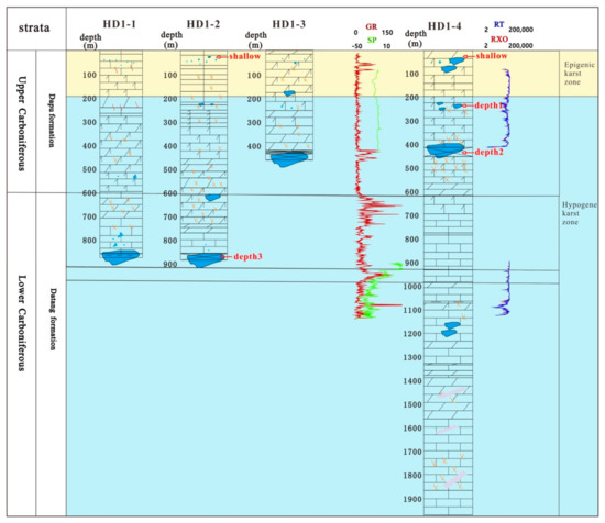 The wells used (HD1-2, HD1-4) are located in the syncline basin of the Huanjiang depression. Four wells are located within 100 m, with a sea level elevation of 200 m. All four wells are found hypogene speleogenesis below sea level (Figure 2). The depth of karst caves in HD1-2 is 861–887 m, developing a large number of reticular fractures and corrosion pores on the upper part (Figure 3a,b). The main karst cave development sections of HD1-4 are 40–80 m, 230–250 m, 420–450 m and 1100–1200 m. Tawny clay filling can be seen in the caves developed above 450 m, and a large number of reticular fractures can be seen on the drill core surface (Figure 3c,d).