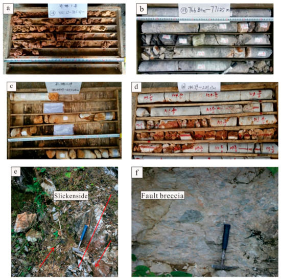 Characteristics of karst development of a single well. (a) Cave filled with clay, 881.69–885 m, HD1-2 well. (b) The reticular cracks, 766.8–771.25 m, HD1-2 well. (c) Caves, 447–453 m, HD1-4 well. (d) Cracks filled with clay, 240–249 m; surface fault mark near the well: (e) slickensides and (f) fault breccia.
