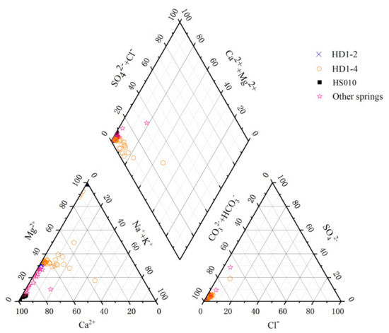 A comparative analysis of the water chemical composition of 22 springs in January showed that HS010 had the lowest TDS, 434.465 ppm, among all the springs, which was quite different from most springs. For the samples of HS010, except for the water sample from October, which had a small TDS value (346.147 ppm), the TDS test results were between 430.465–459.375 ppm. The TDS values for other springs were between 485.581–644.742 ppm. Regardless of the dry or rainy season, the water samples of HS010 were different from the other springs, indicating that HS010 may have different sources of recharge than the other springs [46]. Huanjiang has the highest rainfall in August, and the HS010 spring had the smallest TDS value in October, indicating that HS010 may receive groundwater from distant groundwater formed by atmospheric precipitation infiltration [47].