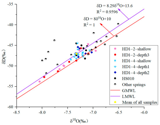 It can be seen from the relationship between δ2H and δ18O that, except for a few other springs, all water samples fell near the GMWL and the LMWL, indicating that the karst groundwater originated from meteoric water [47,55,56].