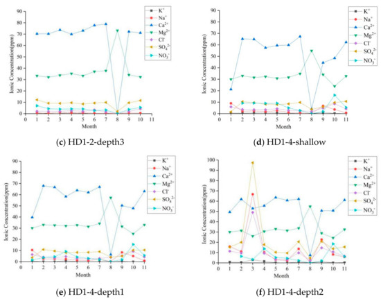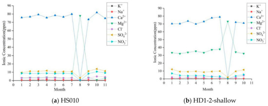 The water chemical compositions at five sampling points for spring HS010 and wells HD1-2 and HD1-4 were compared and analyzed vertically (Figure 7). It was found that the variation trend for the main ion concentration of all water samples was consistent with seasonal rhythm. It was manifested mainly as the concentration of each ion in a stable state from January to July; the concentration of Ca2+ decreased sharply, while the concentration of Mg2+ increased heavily in August and then returned to the initial level in September. This indicated that a close hydraulic connection and frequent conversion relationship existed between well HD1-2 and HS010 during the dry and rainy seasons. The chemical composition of groundwater is affected by meteoric water and presents seasonal fluctuations. The water chemical composition measured at the three vertical sampling points of HD1-4 was different from HD1-2 and HS010. The main manifestation was the consistent variation trend in the rainy season and the opposite in the dry season. This is especially the case for the HD1-4-depth2 water samples in March, where the SO42−, Cl−, Na+, TDS and pH values were the highest values of all the water samples detected. The lithology at sampling point HD1-4-depth2 is dolomitic limestone, with reticular fractures and karst caves. In dry season, the groundwater receives recharge from paleo-water reserved in adjacent caves through reticular fractures, resulting in abnormal chemical composition.