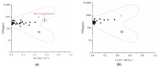 In order to determine the control factors of the chemical composition of karst groundwater, all water sample TDS, cation ratio (Na+/(Na+ + Ca2+)) and anion ratio (Cl−/(Cl− + HCO3−)) were calculated, and a Gibbs diagram was drawn (see Figure 8) [48,49]. The ratio of Na+/(Na+ + Ca2+) was between 0.006 and 0.4, and the ratio of Cl−/(Cl− + HCO3−) was between 0.001 and 0.35. The main controlling factor that determines the chemical composition of groundwater is rock weathering. The HD1-4-depth2 water sample collected in March was affected more by evaporation and concentration than rock weathering, indicating that the groundwater at the sampling point HD1-4-depth2 in the dry season is recharged by the highly concentrated paleo-water from adjacent aquifers or caves [47,50].