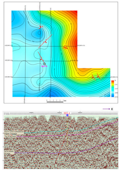 It can be seen from the development stratum of karst caves in the wells that the large set of dolomite and limestone of a Carboniferous system was the main karst strata, the lower voluminous shale of carbonate rock was the bottom surface that could be reached by hypogene karst, and the shale of lower Carboniferous rock pass formation was the bottom surface of karst in this area. The top surface structure map of the Yanguan formation, compiled based on seismic data (Figure 9), shows that the karstification bottom surface is a syncline structure with a steep east and gentle west, high in the north, and low in the middle and south. As there is no seismic data for HS010 further south, the changes in the bottom surface cannot be clearly understood. However, according to regional geological surveys, the core of the southern syncline was cut by the fault (Figure 10).