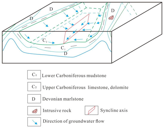 With sufficient dissolution space and good hydrodynamic conditions, the degree of karstification will increase exponentially [59]. The unique syncline structure, vertical and horizontal fault zones and deep circulating groundwater in the study area affect the development of deep karsts in the Huanjiang area. According to comprehensive analysis, this study establishes a hypogene karst development pattern controlled by the deep circulation of groundwater in the syncline structure (Figure 12).