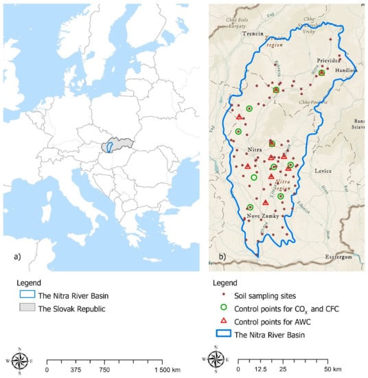 Study area: (a) Position of the Nitra River Basin; (b) Location of the soil sampling sites and control points.