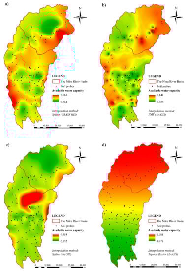 Spatial distribution of available water capacity according to used interpolation methods: (a) Spline (GRASS GIS); (b) IDW (ArcGIS); (c) Spline (ArcGIS); (d) Topo to Raster (ArcGIS).