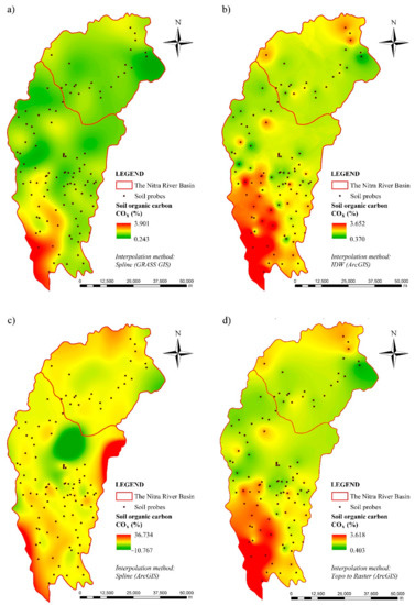 Spatial distribution of soil organic carbon content according to used interpolation methods: (a) Spline (GRASS GIS); (b) IDW (ArcGIS); (c) Spline (ArcGIS); (d) Topo to Raster (ArcGIS).