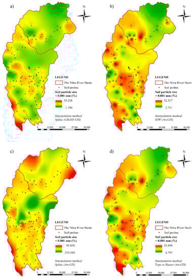 Spatial distribution of clay fraction content <0.001 mm according to used interpolation methods: (a) Spline (GRASS GIS); (b) IDW (ArcGIS); (c) Spline (ArcGIS); (d) Topo to Raster (ArcGIS).