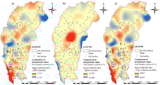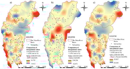 Comparison of GRASS GIS Spline with other interpolation methods for clay fraction content <0.001 mm: (a) Spline (GRASS GIS)—IDW (ArcGIS); (b) Spline (GRASS GIS)—Spline (ArcGIS); (c) Spline (GRASS GIS)—Topo to Raster (ArcGIS).