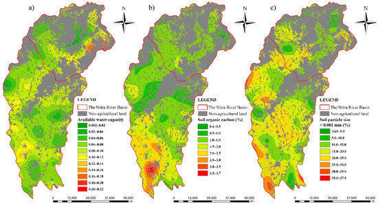 The spatial distribution on agricultural land in the studied basin as estimated by GRASS GIS Spline method: (a) Available water capacity; (b) Soil organic carbon content; (c) Clay fraction content.