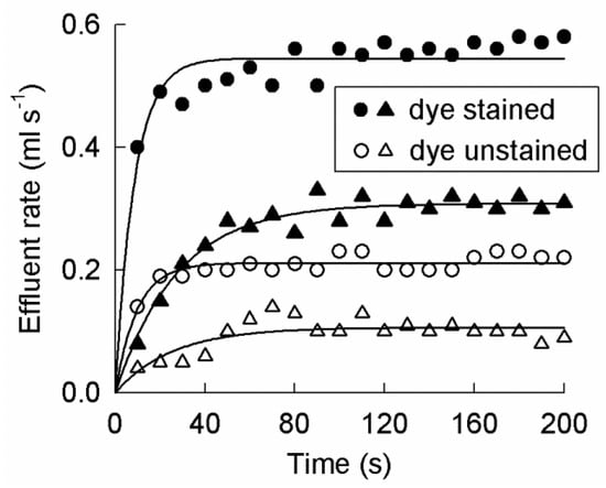The breakthrough curves exhibited a stronger fluctuation in the dye-stained section than in the unstained section (Figure 3). This stronger fluctuation in breakthrough curves was consistent with the results of Radulovich [22]. Compared to the unstained section, the effluent rate stabilized in the dye-stained section at a later time, partly due to its susceptibility to pressure potential. Capillary theory may provide an explanation for this phenomenon. Water flux generated by saturated capillaries is orders of magnitude larger than that in unsaturated capillaries. Similarly, water flux in saturated soils is more sensitive to potential energy [27,29,30] and macropore connectivity (continuity of capillaries) [15,27,30] than that in unsaturated soil. Additionally, the flow inertia and viscosity force may destroy preferential flow paths; however, wetter conditions may facilitate interconnection between macropores [10,15,16], causing a change in connectivity and thereby affecting the effluent rate and steady time of breakthrough curves. In other words, minor changes in soil aeration can result in a major change in water flux, especially for the preferential flow paths. This effect accounted for the stronger fluctuation of breakthrough curves in the dye-stained section.