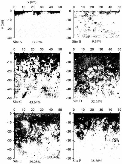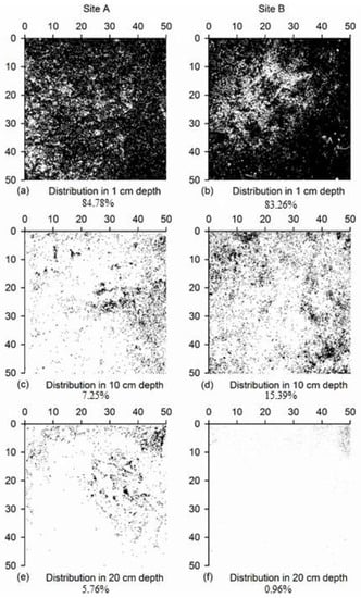 Dye-staining patterns were different between soil layers. At site A, few horizontally oriented paths of preferential flow were found in the 2nd and 3rd soil layers, and the lower layers of the vertical profiles were nearly no dyeing paths (Figure 5a). When considering the total number of preferential flow paths for a certain site, fewer horizontally oriented paths of preferential flow indicate, to some extent, greater vertically oriented preferential flow paths. Consequently, well-developed vertical paths of preferential flow were found in site A. The preferential flow paths exhibited a concentrated pattern of horizontal distribution in the 2nd soil layer (Figure 4c) and a punctiform distribution in the 3rd soil layer (Figure 4d). There was significantly more stained soil in the 2nd soil layer than in the 3rd soil layer. For site B, 0.32% of the soil area in the 3rd soil layer was stained, and the paths of preferential flow were well-developed along the horizontal orientation (Figure 5b). This outcome may have been caused by lateral roots running beneath the surface soil [25,26] or animal activities in this layer [5,25,27]. In general, the distribution of preferential flow paths appeared to be random.