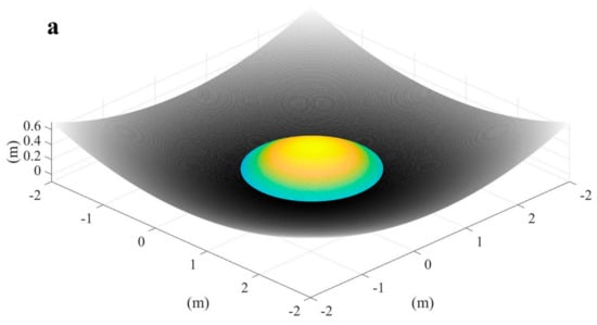 A two-dimensional smooth bed test was adopted here. The case has an analytical solution smooth bed. This test was adopted by many researchers to test their algorithm’s wet-dry treatment and calculation accuracy [27,29,41,42]. The calculation area is a 4 m × 4 m, and the origin of the coordinates is in the center of the calculation area. The mesh size is 0.1 m × 0.1 m. The bed is a parabola rotation: