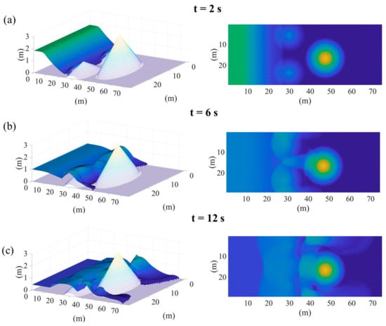 Figure 11 shows the simulated results of six important moments. At 2 s, the water reached two lower humps and started to flow over them. At 6 s, the flood flowed over the two lower humps and started to reached the higher hump. At 12 s, the flood bypassed the higher hump because it could not completely inundate the higher hump. At 30 s, the flood occupied the calculation area. The formed higher flow depth downstream caused backflow. At 100 s, there was still weak flow in the tank. At 300 s, the flow almost stopped and formed a static lake in the tank, and the peaks of all three humps did not submerge. The numerical model properly simulated complex wetting and drying processes and produced similar results to those of other researchers [29,48].