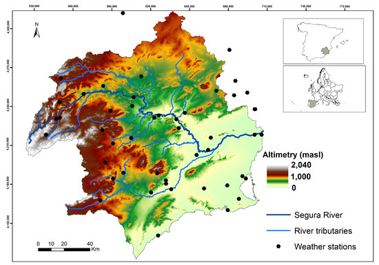 The Segura Hydrographic Demarcation (DHS) (Figure 1) is located in the southeast of the Iberian Peninsula. It has an emerged area of 19,025 km with a large orographic variability, alternating mountain systems that exceed 2000 m.a.s.l. in altitude, with high plateaus, valleys, and coastal depressions [49].