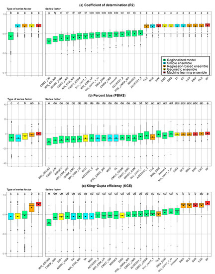 Distributions of (a) coefficient of determination (R), (b) bias percentage (PBIAS), and (c) Kling–Gupta efficiency (KGE) in validation by stations ( stations series = 1296 observations). Grouped by individual series (right) and by the type of series (left). Significantly different groups (Tukey-–Kramer contrast using heteroscedasticity-consistent covariance matrix of the parameters (HC3), alpha = 0.05) are represented by different letters. Post hoc contrasts for PBIAS were calculated with absolute values.
