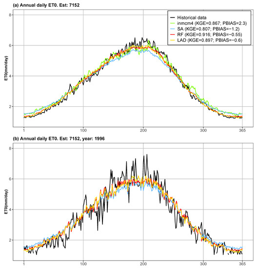 Figure 4 shows, as an example, the prediction of ET (mm day) in weather station 7152, located in the center of the DHS. The figure shows a hypothetical year (a), estimated from the average daily values or the test data, and the results for 1996 (b). Its goodness of fit in validation is good and similar to the average values in Figure 3. It includes the forecasts of the two best MMEs (RF and LAD) and SA as a reference series.