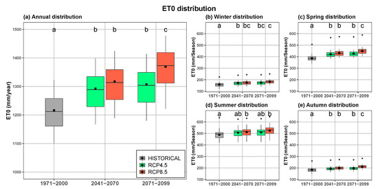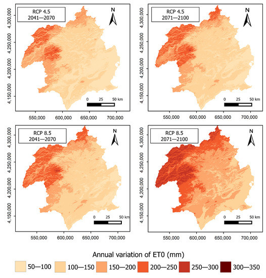 For the spatial characterization, a spatial interpolation based on Random Forest Regression Kriging of mean ET values (mm year) is carried out, comparing the differences of the predicted values in the interpolation surface of the RCP4.5 and RCP8.5 scenarios (for the annual mean values of the periods 2041–2070 and 2071–2099) with respect to the reference HISTORICAL scenario (annual mean values of the period 1971–2000). To estimate whether the differences are significant, the same methods are used as in the previous case.