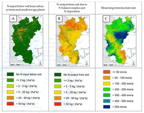 Relevant input parameters for calculating nitrate concentration in the leachate: Nitrogen input below soil from urban systems and small sewage plants (A), Nitrogen output from soil due to agricultural N balance surplus and atmospheric N deposition (B), and mean long-term leachate rate (C).