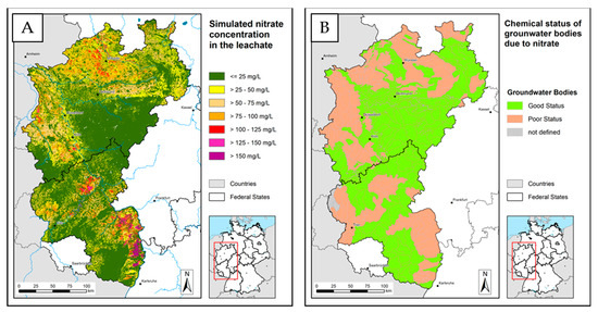 Mean long-term nitrate concentration in the leachate (A) and chemical status of groundwater bodies due to nitrate (status according to the EU Water Framework Directive (B): good status: <50 mg NO3/L, poor status >50 NO3 mg/L.
